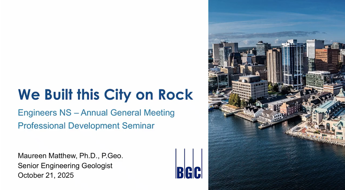 Presented by Maureen Matthew, M.Sc., P.Geo., Engineering Geologist and PhD Candidate in the Department of Earth and Environmental Science at Dalhousie University, this session explores the importance of understanding local geology in civil works and community development, with examples from the Halifax region. It shows how ground conditions directly influence engineering decisions and why bedrock geology should be properly defined during planning and design rather than oversimplified.